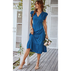 Women's Solid Color V-Neck Flutter Ruffle Sleeve Midi Dress